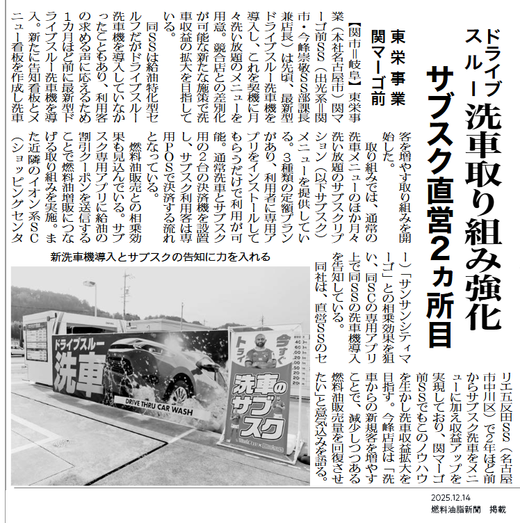 燃料油脂新聞に東栄事業株式会社 関マーゴ前SS様が紹介されました。